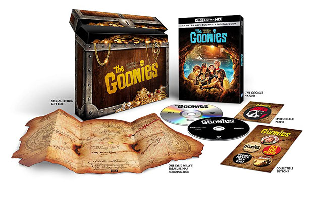 Goonies Never Say Die, and Warner is proving its lasting power by celebrating the 35th anniversary while also upgrading it to 4K. This Exclusive Gift Set is a treasure trove for any Goonies movie buff. Featured are a wonderful “treasure box” gift case, a One Eyed Willy patch, collectible buttons, and the mythical One Eyed Willy treasure map! And of course, the movie is upgraded to 4K, and includes the Blu-Ray and the Digital Copy.