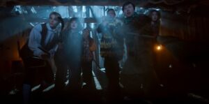 The film’s look here is mostly good with a few sequences being a bit too dark to fully see what is going on, but in general it looks good with the right kind of lighting that helps set the party mood and later the monster mayhem mood. The monster mayhem here is provided by solid practical effects with a creature designed by Allan Cooke that really shines in a sorta kaiju pumpkin kind of way. This is how you do fun effects on a lower age rating. The look of the pumpkin, the ooey gooey goodness, the “gore” for lack of a better word, are all great, giving this film that extra little thing to separate it from other family-friendly genre films.