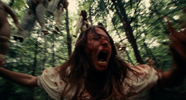 Of course, the film’s most unforgettable presence is Dolly itself. Cloaked in a pink dress and porcelain mask, wielding a shovel as a signature weapon, Dolly is an image of distorted innocence. The performance is chilling not only because of its violence but because of its warped desire to nurture. Visually, Dolly embraces its inspirations. The 70s-style cinematography, warm color grading, and grainy textures give the film the tactile quality of a lost exploitation classic. The camera lingers on disturbing imagery, a cracked porcelain mask, a pristine nursery deep in the woods, and blood-soaked dolls, turning them into icons of terror. The use of silence and sudden bursts of sound heighten unease, while the score pulses with dread, amplifying the grotesque contrast between childlike play and adult violence. The film leans into its extremity, embracing gore, violence, and unnerving imagery without apology. Macy’s transformation into a “human doll” is both cringeworthy and terrifying. Characters spit up blood, wander too far into the woods, and yet survive in ways that challenge audience expectations. The combination of visceral violence and psychological torment ensures that Dolly is not just a cat-and-mouse game, but an exploration of power, survival, and the loss of autonomy.