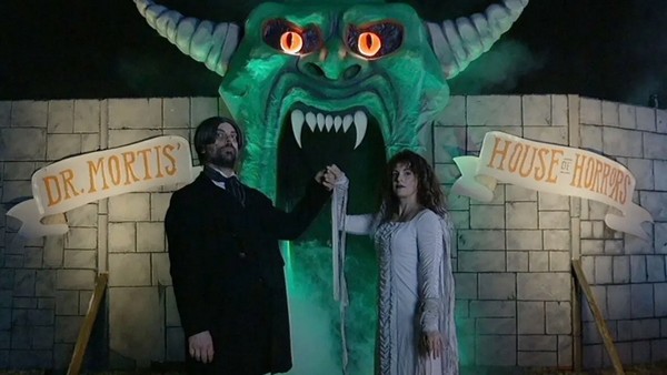 “Home Haunt,” written and directed by Micheline Pitt-Norman & R.H. Norman, closes the program. In many ways, it serves as a celebration for those who love Halloween, transforming their yards and homes into haunted attractions. A local Halloween nut preps for his yearly haunt, with the willing help of his game wife and less willing distant son (a plot point that doesn’t go anywhere). On a personal note, it starts with home movies of said kid as a very young and very excited for Halloween. My 4-year-old is gaga for Halloween, and I fear that won’t last… when he finds a record that claims to bring hell to earth if played on Halloween. Perfect new music for the haunt! The crux is just what you expect from that. Once it gets into it, it’s a wild blast. And it features special effects master Rick Baker! Lots of fun deaths, and the sheer joy of a haunted attraction, and Halloween pervades.