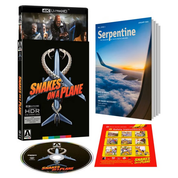 Arrow offers Snakes on a Plane in both 4k UHD and Blu-ray (separate releases). The disc is housed in a standard case. The reversible sleeve has one side with the medical staff parody art on one side, and a Sam Jackson action shot on the reverse. The slip is the medical. It includes a booklet with essays and a “safety card” of the airline.