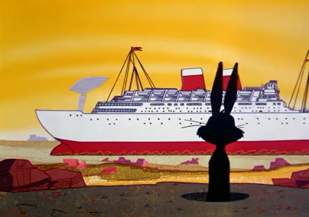 While “Compressed Hare” falls victim to Chuck Jones’ penchant for having his characters constantly breaking the fourth wall, Dave Detiege’s script adds a new dimension by having Bugs and Wile E. one-upping each other with wonderfully bad puns. There are also some inventive visuals, most notably a striking shot of Bugs in foreground silhouette watching an ocean liner get dragged across the Southwestern landscape by Wile E.’s magnet. (See below)