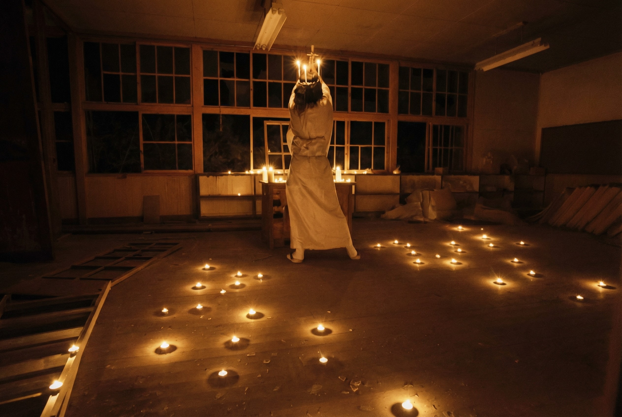 One of the film’s strongest aspects here is the visual one. The set dressing, costumes by Rafaela Fabbo Yamamoto, lighting, and the cinematography by Benjamin Parrot around it all are just right together. The lighting and camera work together create stunning images, especially in the last third of the film. This is a stunning short film and one where the visuals are such a big part of it. The special effects here are minimal with some interesting CGI effects and practical effects by Pedro Paladini. This is not a gore heavy film or even a bloody film really. There is a bit of special effects, but the images in general speak for themselves without it and the film as a whole works without showing a lot of, well, anything. The mystery here is a big part of what creates fear.